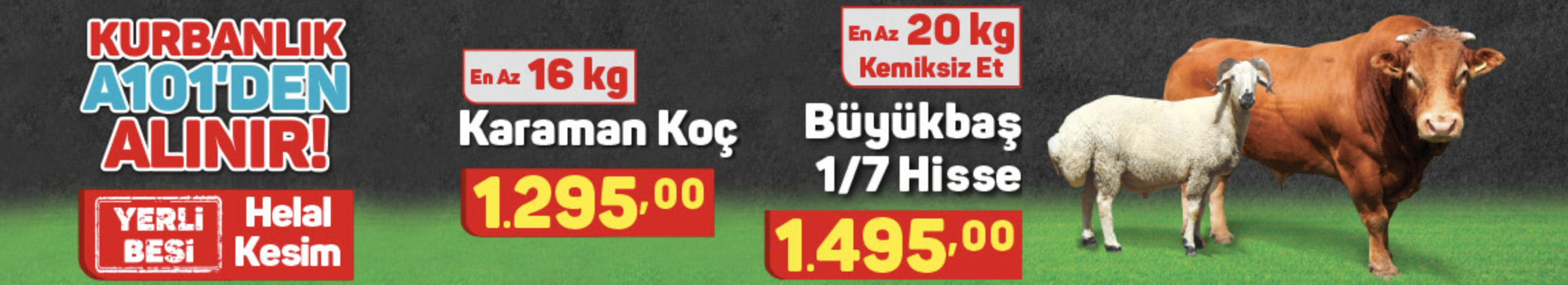 A101 14 kiloluk Karaman Koç kurbanlık fiyatı bin 195 TL olarak açıklanmıştı. A 101'de kurbanlık dana fiyatı ise 20 kilogram et için bin 345 TL olarak satışa sunulmuştu. Denizbank kartı olanları 50 TL indirim sağlanırken, Maximum, Bonus, Yapı Kredi World kredi kartlarına peşin fiyatına 4 taksit imkanı sunuldu.