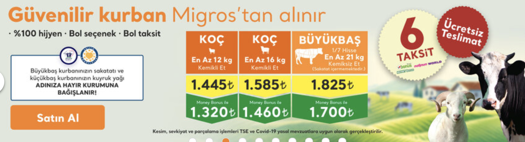 Migros'ta Boney Club kartı ile kurbanlık alımında 100 TL indirim yapılmış, Maximum, Bonus, Yapı Kredi World kredi kartlarına ise 6 taksit imkanı tanınmıştı.