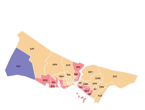 31 Mart yerel seçimlerinde ilçe belediye başkanlığı seçim sonuçları. (Sarılar AK Parti, kırmızılar CHP, mavi ise MHP) 23 Haziran seçim sonuçlarını anlık olarak takip etmek için de aşağıdaki linke tıklayın)