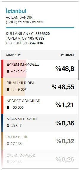 ANKA'ya göre yüzde 54,20 oy oranı ve 4 milyon 740 bin 519 oy alan Ekrem İmamoğlu, 31 Mart'ın ardından yeniden İstanbul Büyükşehir Belediye Başkanı seçildi. Yüzde 44,99 oy oranı ve 3 milyon 934 bin 692 oy alan Binali Yıldırım ise seçimleri kaybetti... (Bu sonuçlar kesin değildir. Kesin sonuçlar YSK'nin açıklamasıyla belli olacaktır.)