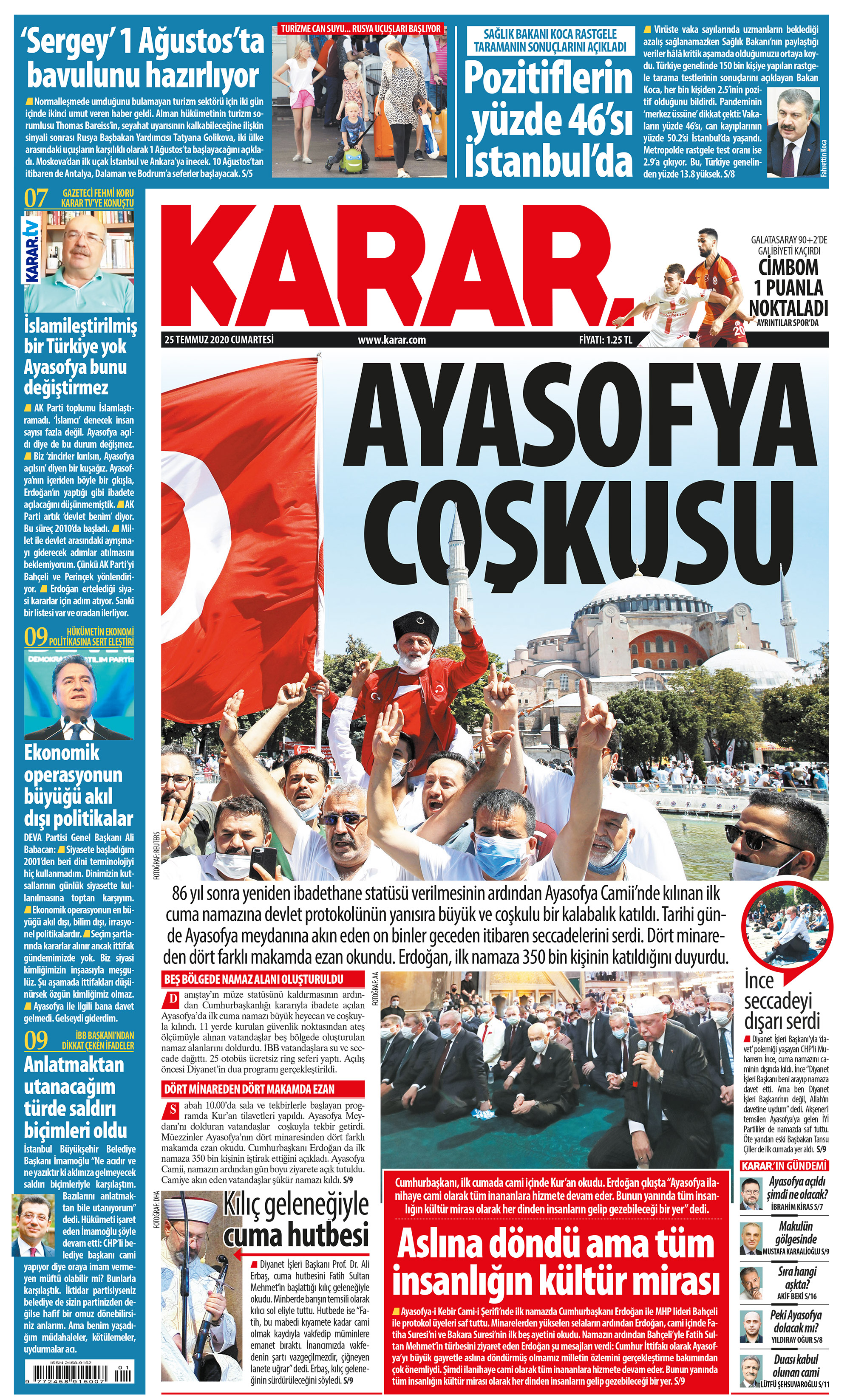 1934 tarihli Bakanlar Kurulu kararının iptalinin ardından statüsü yeniden camiye çevrilen Ayasofya’daki ilk namazda tarihi anlar yaşandı. Seccadelerini geceden sermeye başlayan on binler yan yana saf tuttu. Camide Kur’an okuyan Erdoğan, alanda 350 bin kişinin namaz kıldığını açıkladı. Diyanet Işleri Başkanı da minbere fetih geleneğinin sembolü olan kılıçla çıktı. Hutbeyi de fetih sancaklarının altından aktardı. Birçok ülkede canlı yayınlanan anlarda dört minareden dört farklı makamda ezan okundu.