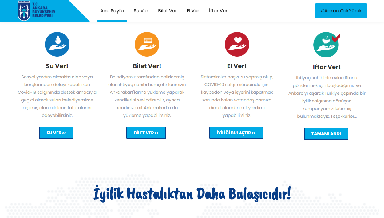 "Su Ver" butonuna tıklayarak Ankara'da yaşayan, sosyal yardım almakta olan veya borçlarından dolayı kapalı olan ancak salgın nedeniyle suları açılan ailelerden herhangi birine ait su faturasını ödeyebilecek.
