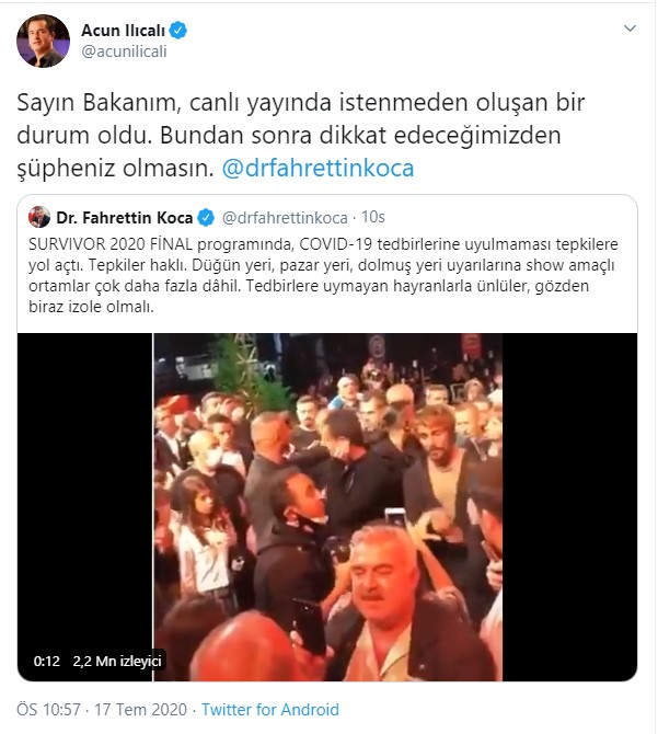 Koca'nın bu paylaşımının ardından Acun Ilıcalı'dan "Sayın Bakanım, canlı yayında istenmeden oluşan bir durum oldu" yanıtı geldi.