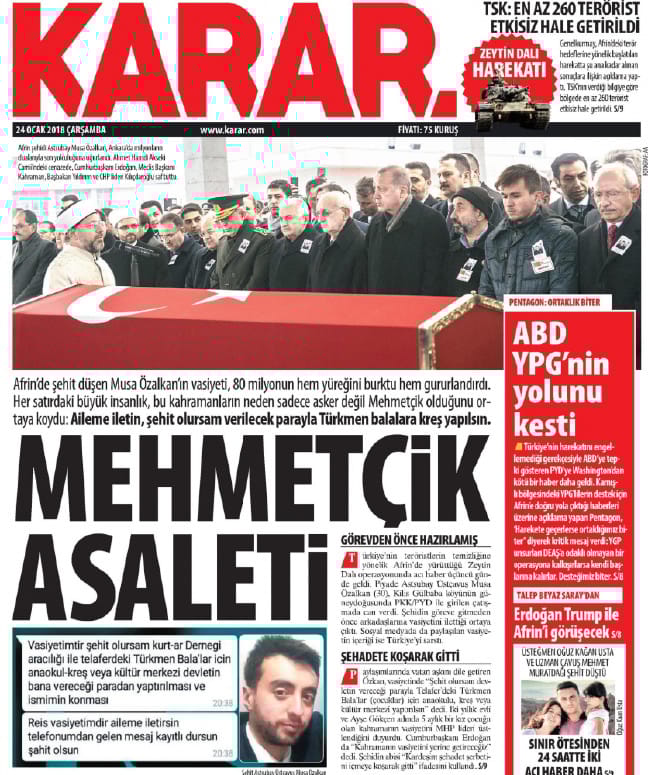 Afrin Şehidi Musa Özalkan da vasiyetinde devletin bağlayacağı maaşla Türkmenler için okul yaptırılmasını istemişti. KARAR, şehidin son arzusunu, "Mehmetçik asaleti" başlığı ile manşetine taşımıştı