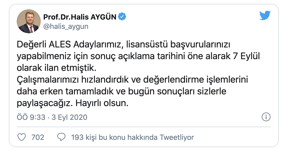 ÖSYM Başkanı Prof. Dr. Halis Aygün, sosyal medya hesabından yaptığı açıklama ile ALES sınav sonuçlarının açıklanmasını erkene aldıklarını duyurdu.
