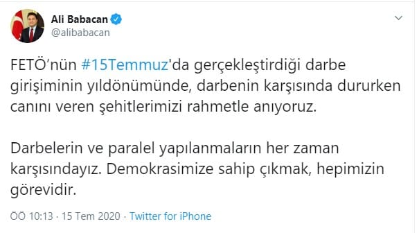 FETÖ'nün 15 Temmuz 2016'da kalkıştığı hain darbe girişiminin 4. yıl dönümüne ilişkin paylaşımda bulunan DEVA Partisi lideri Ali Babacan, 'Darbelerin ve paralel yapılanmaların her zaman karşısındayız. Demokrasimize sahip çıkmak, hepimizin görevidir' dedi.