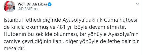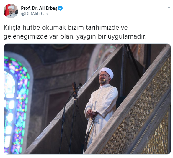 Diyanet İşleri Başkanı Ali Erbaş, Ayasofya'daki kılıçlı hutbe hakkında açıklamalarda bulundu. Erbaş, ‘Bu durumu garipseyen, eleştiren, farklı manalara çekmeye çalışan yaklaşımları hayretle karşılıyorum’ dedi.