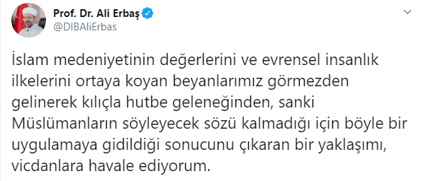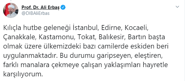 İslam medeniyetinin değerlerini ve evrensel insanlık ilkelerini ortaya koyan beyanlarımız görmezden gelinerek kılıçla hutbe geleneğinden, sanki Müslümanların söyleyecek sözü kalmadığı için böyle bir uygulamaya gidildiği sonucunu çıkaran bir yaklaşımı, vicdanlara havale ediyorum.