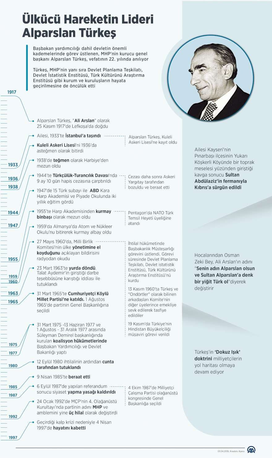 Başbakan Yardımcılığı ve Devlet Bakanlığı yapan MHP kurucusu Alparslan Türkeş’in gerçek ismi Ali Arslan’dır. Kıbrıs’ta doğan Alparslan Türkeş, asker kökenlidir ve NATO’da görev almıştır. Vefatının ardından birçok kesimi derin üzüntüye boğan ve her yıl 4 Nisan’da mezarı başında tören düzenlenen Alparslan Türkeş’in hayat hikâyesi karar.com’da…