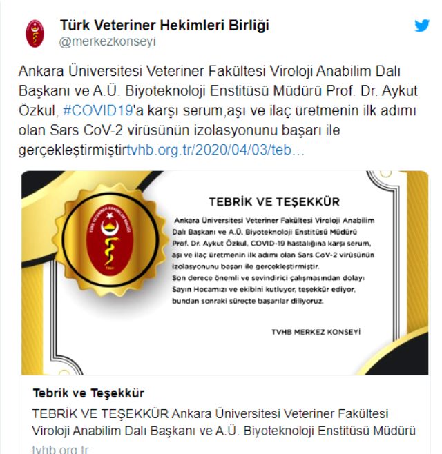 Öte yandan, Ankara Üniversitesi resmi Twitter hesabından yapılan açıklamada ise, "Üniversitemiz Biyoteknoloji Enstitüsü Müdürü Prof. Dr. Aykut Özkul, koronavirüse karşı (Covid-19) serum, aşı ve ilaç üretmenin ilk adımı olan SARS-COV-2 virüsünü izole etmeyi başardı!" denildi.
