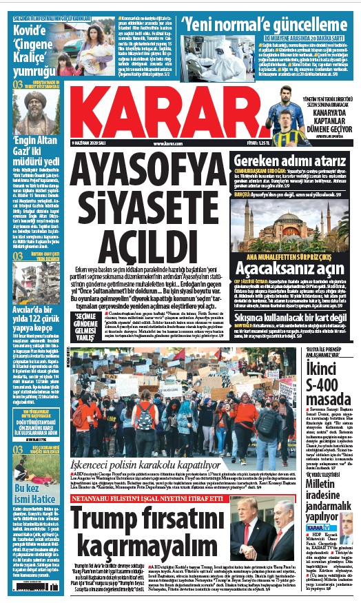 Cumhurbaşkanı Erdoğan TRT’de katıldığı programda gündeme ilişkin açıklamalarda bulundu. Ayasofya’nın ibadete açılması tartışmalarını değerlendiren Erdoğan “Yunanistan boş durmuyor, kurusıkı atıyor. Sen kiminle dans ediyorsun? Haddini bil! ‘Sakın ha! Ayasofya’yla ilgili orayı camiye çevirmeyin’ Türkiye’yi siz mi idare ediyorsunuz, biz mi? Türkiye’nin kurumları var. Karar verilir icra makamı gerekli adamı atar. Bunun için sizden izin almaya, müsaade almaya asla tevessül etmez. Danıştay’ın vereceği bekliyoruz. Sonra da atılması gereken neyse ona göre atılır” dedi. AK Parti Merkez Karar ve Yönetim Kurulu (MKYK) sonrası açıklama yapan Ömer Çelik de “Kilise olarak hizmet verdikten sonra camiye dönüştürülmüştür. Ayasofya Camii olarak kalplerde her zaman özel bir yere sahiptir. Çalışmalar belli bir karara vardıktan sonra Cumhurbaşkanımız tarafından açıklanacaktır” ifadelerini kullandı.