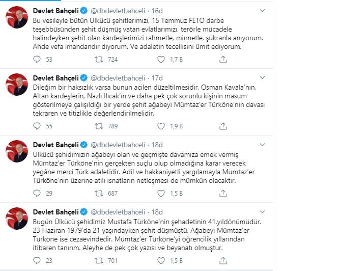 "Aleyhe de pek çok yazısı ve beyanatı olmuştur. Ülkücü şehidimizin ağabeyi olan ve geçmişte davamıza emek vermiş Mümtazer Türköne’nin gerçekten suçlu olup olmadığına karar verecek yegane merci Türk adaletidir. Adil ve hakkaniyetli yargılamayla Mümtazer Türköne'nin üzerine atılı isnatların netleşmesi de mümkün olacaktır. Dileğim bir haksızlık varsa bunun acilen düzeltilmesidir. Osman Kavala'nın, Altan kardeşlerin, Nazlı Ilıcak'ın ve daha pek çok sorunlu kişinin masum gösterilmeye çalışıldığı bir yerde şehit ağabeyi Mümtazer Türköne'nin davası tekraren ve titizlikle değerlendirilmelidir. Bu vesileyle bütün Ülkücü şehitlerimizi, 15 Temmuz FETÖ darbe teşebbüsünden şehit düşmüş vatan evlatlarımızı, terörle mücadele halindeyken şehit olan kardeşlerimizi rahmetle, minnetle, şükranla anıyorum. Ahde vefa imandandır diyorum. Ve adaletin tecellisini ümit ediyorum."