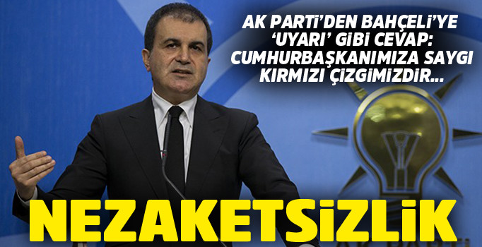 Bahçeli'nin sert çıkışına AK Parti'den sert cevap geldi. AK Parti Sözcüsü Ömer Çelik basın toplantısında "Cumhurbaşkanımız imalarla konuşmayı sevmez. İma yollu MHP'yi ifade ettiğini söylemek Cumhurbaşkanımızı yeterince tanımamaktır. Cumhurbaşkanımız MHP'ye bir şey söyleyecekse açıkça MHP ismini zikrederek yapabilir. Baştan aşağı yanlış bir değerlendirmedir. Bahçeli'nin ifadeleri siyasi nezakete uygun değildir. Cumhurbaşkanımıza gösterilmesi gereken saygı AK Parti'nin kırmızı çizgisidir" dedi. Çelik şöyle devam etti: