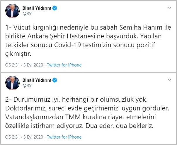 Konuyla ilgili sosyal medya hesabından açıklama yapan Binali Yıldırım, şu ifadelere yer verdi: "Vücut kırgınlığı nedeniyle bu sabah Semiha Hanım ile birlikte Ankara Şehir Hastanesi'ne başvurduk. Yapılan tetkikler sonucu Covid-19 testimizin sonucu pozitif çıkmıştır. Durumumuz iyi, herhangi bir olumsuzluk yok. Doktorlarımız, süreci evde geçirmemizi uygun gördüler. Vatandaşlarımızdan TMM kuralına riayet etmelerini özellikle istirham ediyoruz. Dua eder, dua bekleriz."