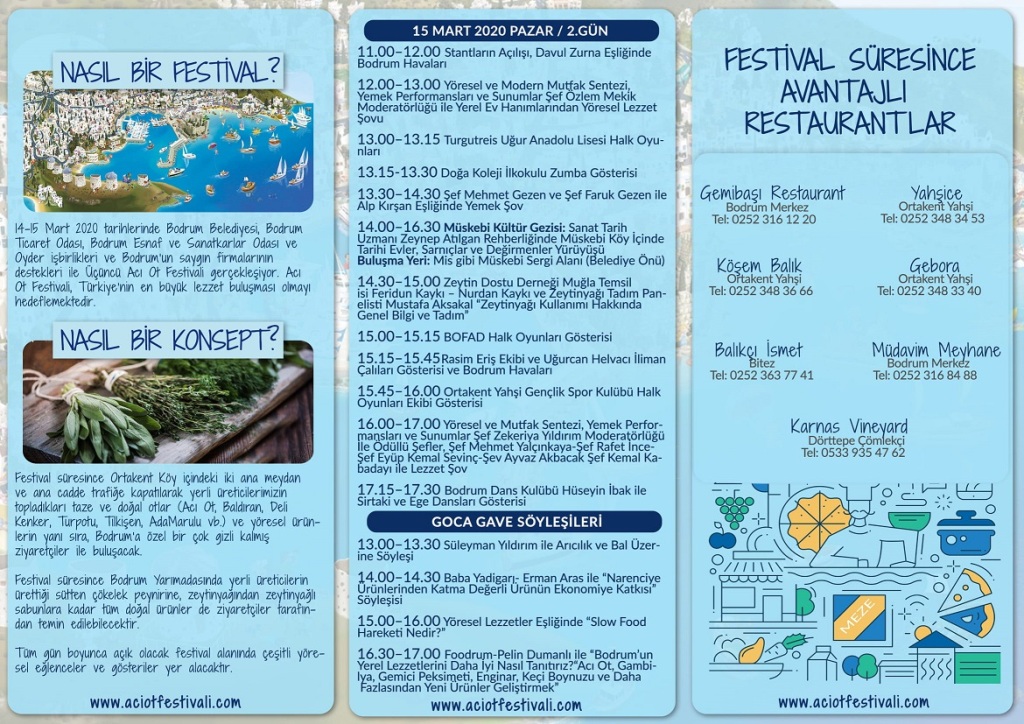 Bodrum’un en lezzetli buluşması olarak nitelendirilen ve kentin geleneksel kimliğini dünyaya tanıtmayı amaçlayan Acı Ot Festivali, bu yıl konserlerle de renklenecek. Türkiye’nin pek çok kentinden özel turlarla konukların akın edeceği festivalde, Bodrumlu sanatçı Reha Ergene ile Rasim Eriş ve ekibi türküleriyle konukları mest ederken, Uğurcan Helvacı da zeybek oyunları ile sahnede olacak. Karya Çiçekleri Spor Kulübü, Uğur Koleji Halk Oyunları ekibi ve Doğa Koleji Bandosu da yöresel ezgiler ve halk oyunları gösterileri ile festivalde yer alacak. Festival süresince Goca Gave söyleşileri de, tüm gün boyunca devam edecek.