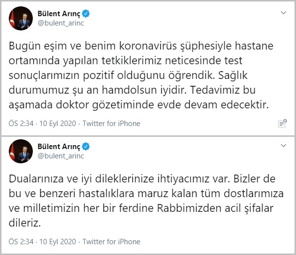 Arınç Twitter paylaşımında, "Bugün eşim ve benim koronavirüs şüphesiyle hastane ortamında yapılan tetkiklerimiz neticesinde test sonuçlarımızın pozitif olduğunu öğrendik. Sağlık durumumuz şu an hamdolsun iyidir. Tedavimiz bu aşamada doktor gözetiminde evde devam edecektir. Dualarınıza ve iyi dileklerinize ihtiyacımız var. Bizler de bu ve benzeri hastalıklara maruz kalan tüm dostlarımıza ve milletimizin her bir ferdine Rabbimizden acil şifalar dileriz" ifadelerini kullandı.
