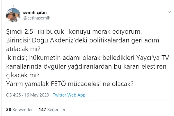 "Tümamiral Cihat Yaycı! Deniz Kuvvetlerinin akademik kariyeri en yüksek subaylarından birisi. Meslekteyken birlikte çalışma olanağımız olmadı. Balyoz davasında tutuklandık. Onun için FETÖcü dediler. Deniz Kuvvetlerinde FETÖ'nün canına okudu. Yıllardır savsaklanan Doğu Akdeniz politikasının mimarı oldu. Kitaplar yazdı. Hükümetin adamı dediler. Yaptıklarına bakınca bana gerçek bir Mavi Vatan savunucusu gibi geldi. Bugün görevden alınmış. Bakın bakalım en çok kimler seviniyor? Yunanlılar ve FETÖcüler. Hayırlı işler! Şimdi 2.5 -iki buçuk- konuyu merak ediyorum. Birincisi; Doğu Akdeniz'deki politikalardan geri adım atılacak mı? İkincisi; hükumetin adamı olarak belledikleri Yaycı'ya TV kanallarında övgüler yağdıranlardan bu kararı eleştiren çıkacak mı? Yarım yamalak FETÖ mücadelesi ne olacak?" dedi.