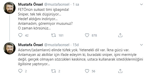 Balyoz davası mağdurlarından Emekli Kurmay Albay Mustafa Önsel ise, sosyal medya hesabından "FETÖnün suikast timi işbaşında! Sniper, tek tek düşürüyor... Hedef aldığını indiriyor... Anlamadım, göremiyor musunuz? O zaman körsünüz... Adamın/(adamların) elinde tüfek yok. Yetenekli dil var. İkna gücü var. Anlamayan az akıllılar için ifade edeyim ki, buradaki sniper, işini mermiyle değil, gerçek olmayan sözcükleri keskince, ustaca kullanarak istedi(klerini)ğini ilgilisine yaptırıyor..." yorumunu yaptı.