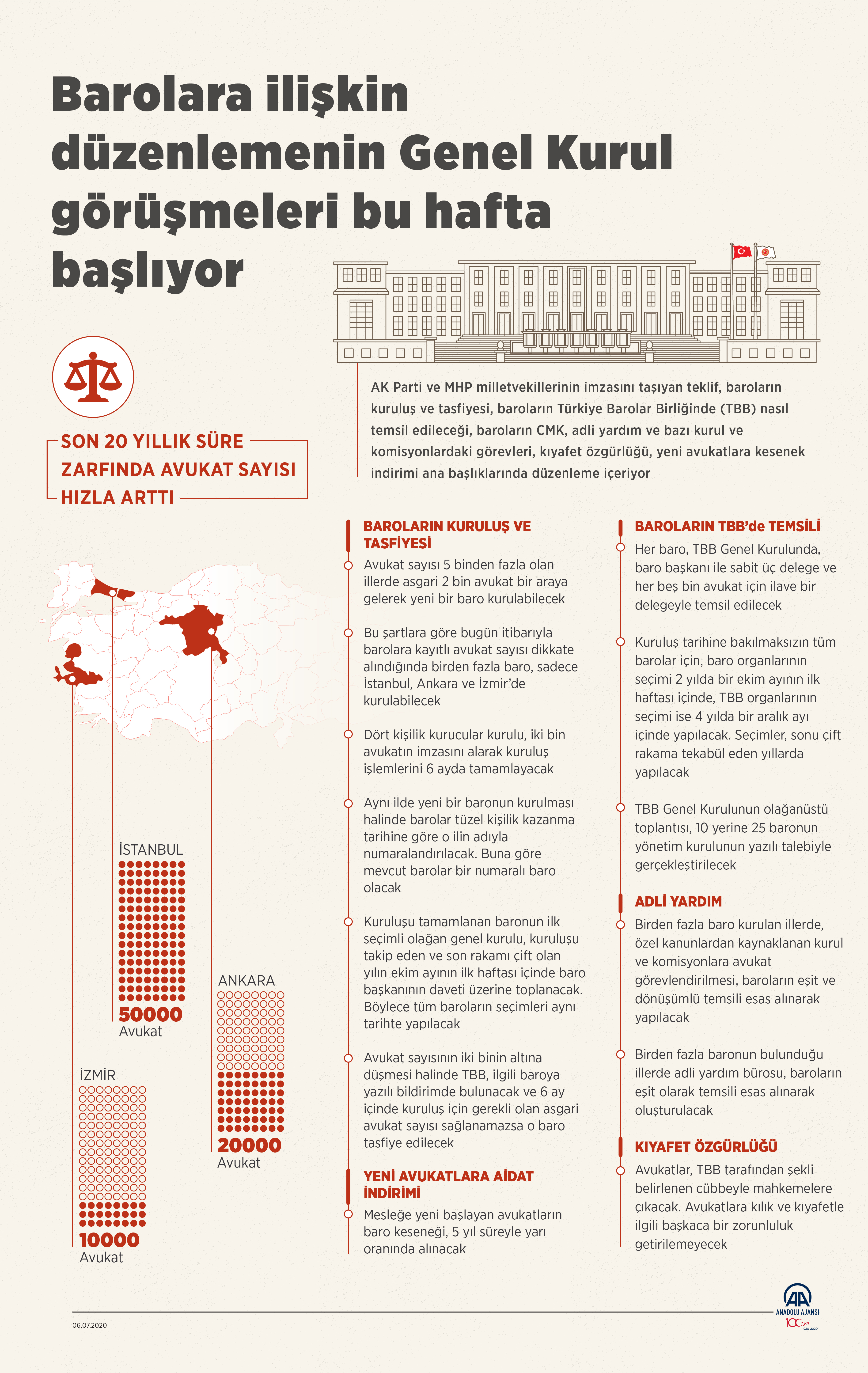 TBMM Adalet Komisyonunda kabul edilen, barolara ilişkin düzenlemeyi içeren Avukatlık Kanunu ile Bazı Kanunlarda Değişiklik Yapılmasına Dair Kanun Teklifi, bu hafta TBMM Genel Kurul'u gündeminde olacak.