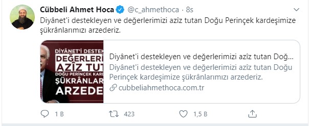 Cübbeli Ahmet Hoca, "Diyânet'i destekleyen ve değerlerimizi azîz tutan Doğu Perinçek kardeşimize şükrânlarımızı arz ederiz" dedi.