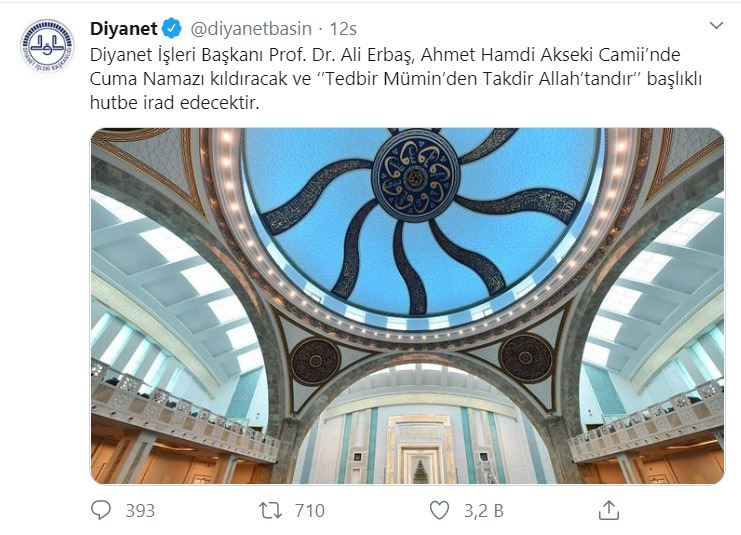 Koronavirüs sebebiyle 13 Mart Cuma günü, Cuma namazının kılınmayacağına dair, Diyanet İşleri Başkanı Ali Erbaş’ın sosyal medya hesabından yapılmış gibi gösterilen ve gerçekle ilgisi olmayan bir ekran görüntüsünün, çok sayıda sosyal medya gruplarında paylaşıldığının öğrenildiğini anımsatan Diyanet İşleri Başkanlığı Özel Kalem Müdürü Hasan Güçlü, "Cuma namazının kılınmaması gibi bir durum söz konusu değildir. İtibar edilmemesi istirham olunur" dedi.