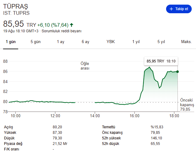 TUPRS hissesi önceki gün yüzde 7.64 oranında bir artış gösterdi.