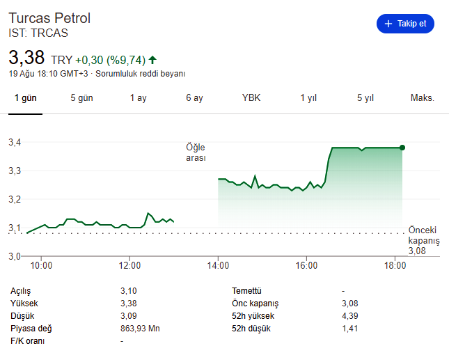 TRCAS Hissesinde ise tavan yaptı ve yüzde 9.74 oranında bir artış görüldü.