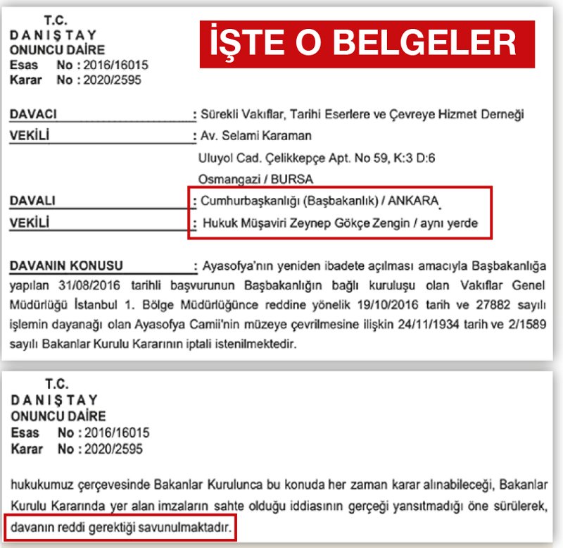 Sözcü gazetesinden Saygı Öztürk'ün haberine göre, Ayasofya'nın yeniden ibadete açılması amacıyla Başbakanlığa 2016'da başvurulmuştu. Vakıflar Genel Müdürlüğü İstanbul 1. Bölge Müdürlüğü bu isteği reddetti. Derneğin savunması şöyle oldu: “Dava konusu Bakanlar Kurulu Kararındaki imzaların gerçekliği incelenmeli. Tapuda ‘müze' değil, ‘cami' ifadesi yer alıyor. Vakıf malı olan Ayasofya'nın cami olarak kullanılması gerektiğinden Bakanlar Kurulu kararı iptal edilmeli.”