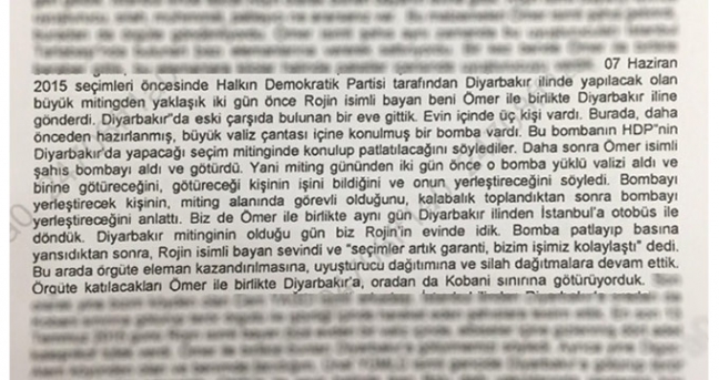"7 Haziran 2015 seçimleri öncesinde HDP tarafından Diyarbakır ilinde yapılacak olan büyük mitingden yaklaşık iki gün önce Rojin isimli bayan beni Ömer isimli şahıs ile Diyarbakır'a gönderdi. Diyarbakır'da eski çarşıda bulunan bir eve gittik. Evde üç kişi vardı. Burada daha önceden hazırlanmış, büyük valiz çantası içine konulmuş bir bomba vardı. Bu bombanın HDP'nin Diyarbakır'da yapacağı seçim mitinginde konulup patlatılacağını söylediler. Daha sonra Ömer isimli şahıs bombayı aldı ve götürdü. Yani miting gününden iki gün önce o bomba yüklü valizi aldı ve birine götüreceğini, götüreceği kişinin işini bildiğini ve onun yerleştireceğini söyledi.