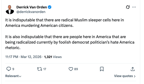 Wisconsin Temsilcisi Derrick Van Orden, ABD’de “radikal Müslüman uyuyan hücreler” bulunduğunu savunduğu bir paylaşım yaptı: