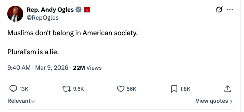Tennessee Temsilcisi Andy Ogles, 9 Mart tarihli paylaşımında “Müslümanlar, Amerikan toplumuna ait değil. Çoğulculuk bir yalandır” ifadelerini kullandı. Açıklama eleştirilirken, Temsilciler Meclisi Başkanı Mike Johnson’ın konuya ilişkin bir kınama yapmaması da gündeme geldi.