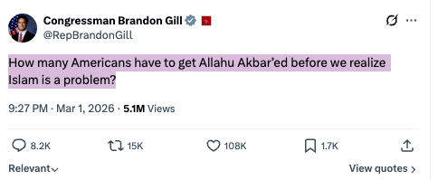 Texas Temsilcisi Brandon Gill ise 1 Mart tarihli paylaşımında, “İslam'ın bir sorun olduğunu anlamamız için daha kaç Amerikalının 'Allahu Ekber'lenmesi gerekiyor?” ifadesini kullandı.