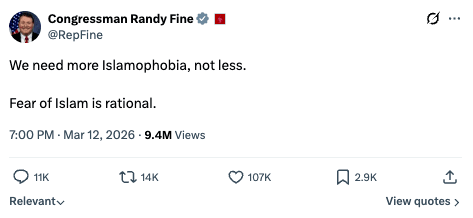 Florida Temsilcisi Randy Fine, 12 Mart’ta yaptığı paylaşımda “Daha fazla İslamofobiye ihtiyacımız var, daha azına değil. İslam korkusu rasyoneldir” dedi.
