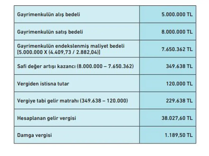 Vergiye Esas Kâr: Satış Bedeli (8 Milyon) - Endekslenmiş Maliyet (7.65 Milyon) = 350 bin TL.