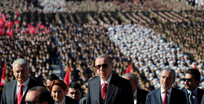 Cumhurbaşkanı Erdoğan ve beraberindeki heyet 29 Ekim Cumhuriyet Bayramı töreni için Anıtkabir'e geldi. Törene Cumhurbaşkanı Yardımcısı Fuat Oktay, Meclis Başkanı Binali Yıldırım, CHP lideri Kemal Kılıçdaroğlu, MHP lideri Devlet Bahçeli, İYİ Parti lideri Meral Akşener, BBP lideri Mustafa Destici, Milli Savunma Bakanı Hulusi Akar ve çok sayıda devlet görevlisi katıldı.