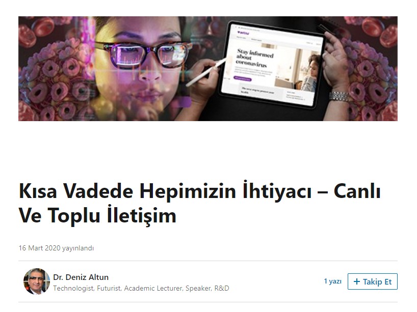 * Dr. Deniz Altun'un uzaktan çalışma, online eğitim gibi konuları ele aldığı 'Kısa Vadede Hepimizin İhtiyacı - Canlı ve Toplu İletişim' başlıklı yazısını buradan okuyabilirsiniz.