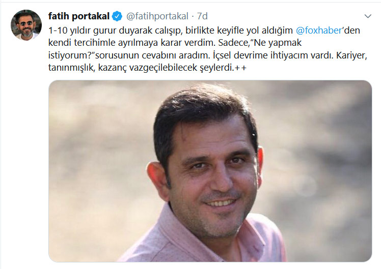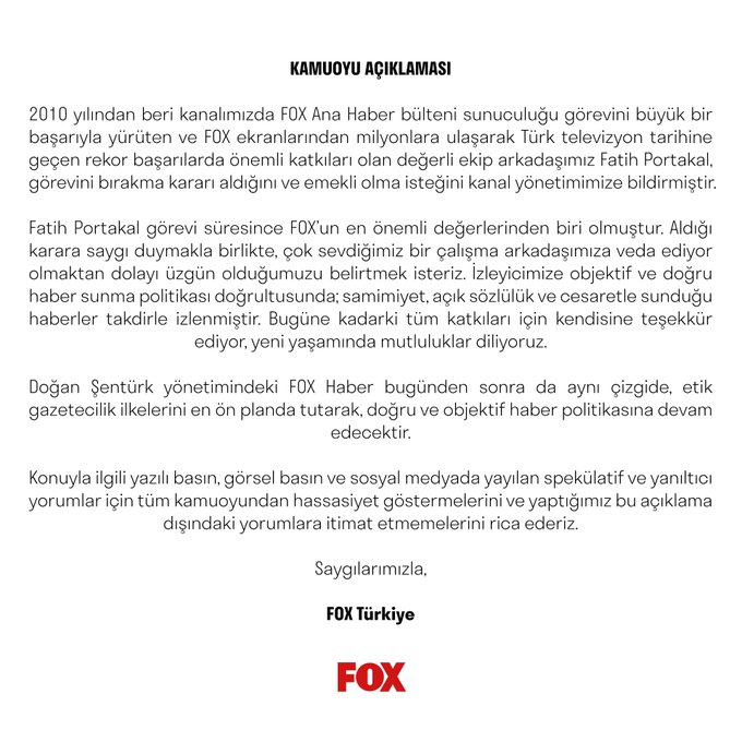 Fox Tv'nin sosyal medya hesabından yapılan açıklamada Gazeteci Fatih Portakal'ın görev bırakarak emekliliğini istediği duyuruldu.