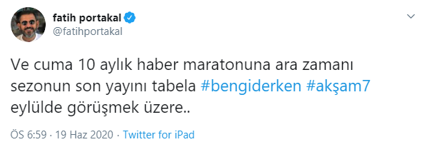 Fox Ana Haber Bülteni sunucusu Fatih Portakal, 19 Haziran 2020 Cuma günü ekrana gelen programda, kısa bir süre ekranlarda olmayacağını açıklayarak veda etti. Her sene olduğu gibi yaz tatili nedeniyle ekranlardan uzaklaşan Fatih Portakal, sosyal medyadan paylaştığı mesajında eylül ayında yeniden Fox TV ekranlarında olacağını belirtti.