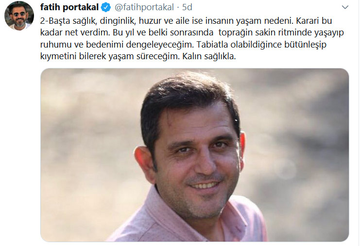 Başta dinginlik, sağlık, aile ve huzurun ise insanın yaşam nedeni olduğunu aktaran Portakal, kararı bu sebeple net verdiğini belirterek, bu sene ve belki de sonrasında torağın sakin ritminde yaşayarak, ruhunu ve bedenini dengeleyeceğini bildirdi. Ünlü gazeteci Portakal, tabiatla olabildiğince bütünleşerek, kıymetini bilerek yaşamı süreceğini söyledi ve ‘Kalın sağlıkla.’ diyerek FOX TV ekranlarına veda ettiğini duyurdu.
