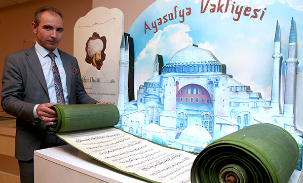 Ayasofya Vakfiyesi'nin özelliklerine ilişkin bilgi veren Şahin, "Ayasofya Vakfiyemiz 65 metre 30 santimetre uzunluğunda ve 38 santimetre enindedir. 110 eklentiden oluşmaktadır. Kısmen ceylan derisi, kısmen de aharlı kağıt üzerine yazılmış ve dili Arapçadır. Dışı da ipek atlasla kaplanmıştır" dedi.