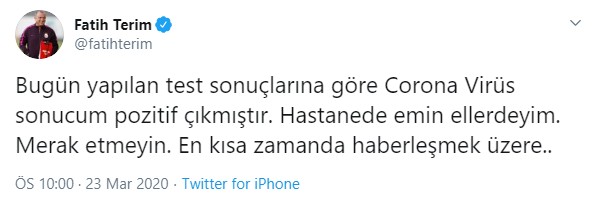 Galatasaray teknik direktörü Fatih Terim, 23 Mart 2020 günü sosyal medyadan yaptığı paylaşımla corona virüs (koronavirüs) testinin pozitif çıktığını ve hastanede tedavi altına alındığını söylemişti. Terim, "Bugün yapılan test sonuçlarına göre koronavirüs sonucum pozitif çıkmıştır. Hastanede emin ellerdeyim. Merak etmeyin. En kısa zamanda haberleşmek üzere" ifadelerini kullanmıştı.
