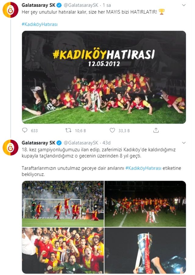 12 Mayıs 2012 tarihinde Fenerbahçe'nin stadında kazanılan şampiyonluğa göndermede bulunulan paylaşımda "Her şey unutulur hatıralar kalır, size her Mayıs bizi hatırlatır" sözlerine yer verildi.