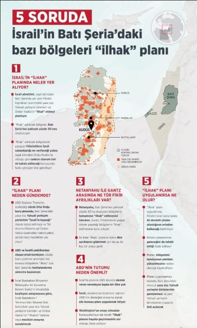 Netanyahu ile Savunma Bakanı Gantz'ın imzaladığı koalisyon anlaşmasına göre, İsrail Başbakanı 1 Temmuz'dan itibaren Batı Şeria'daki yasa dışı Yahudi yerleşim birimleri ve Ürdün Vadisi'nin "ilhakını" kabine veya meclisin onayına sunabilecek.