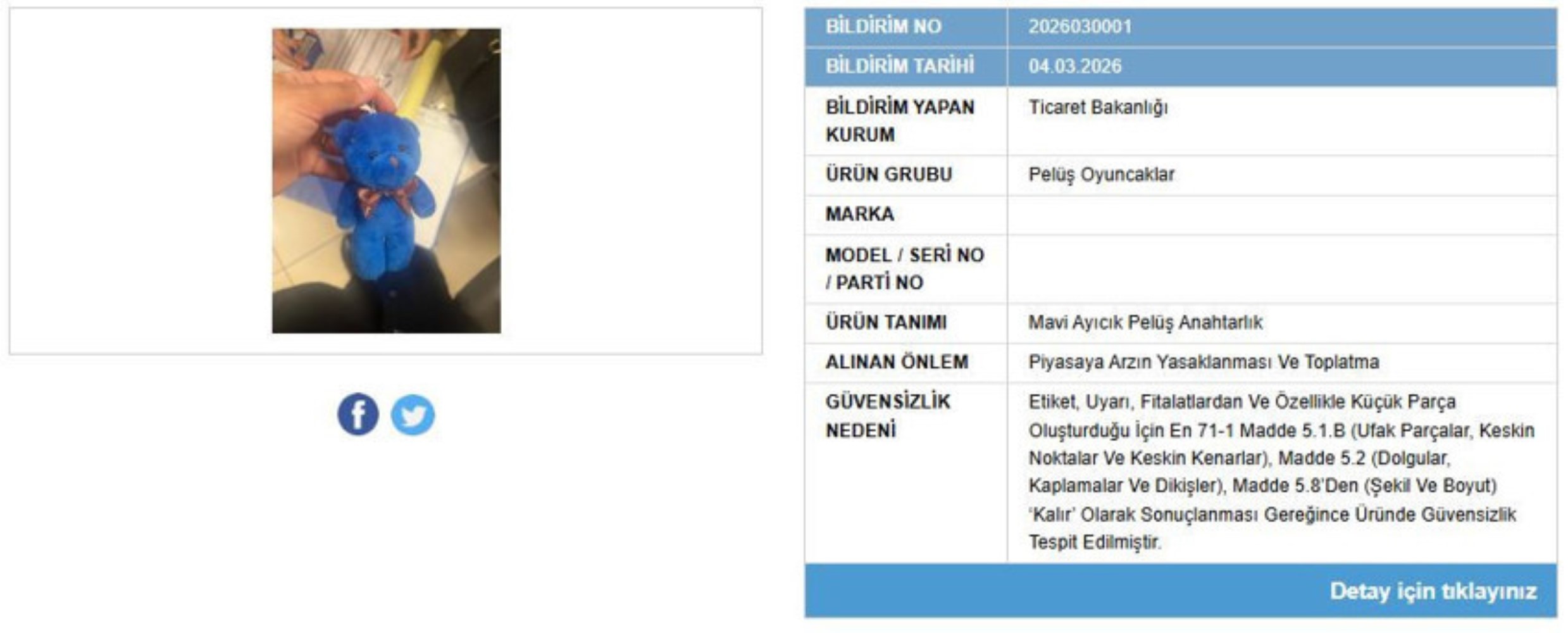 Ticaret Bakanlığı, piyasadaki ürünlere yönelik denetimleri kapsamında bir pelüş oyuncağın güvensiz olduğunu tespit etti.