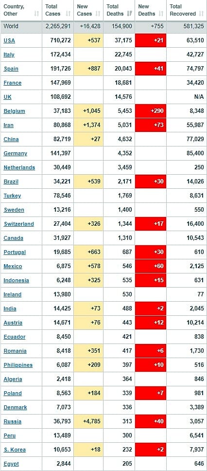 Koronavirüs nedeniyle 18 Nisan 2020 saat 14.30 itibariyle dünya genelinde 154 bin 900 kişi, Türkiye'de ise 1769 vatandaşımız hayatını kaybetti.