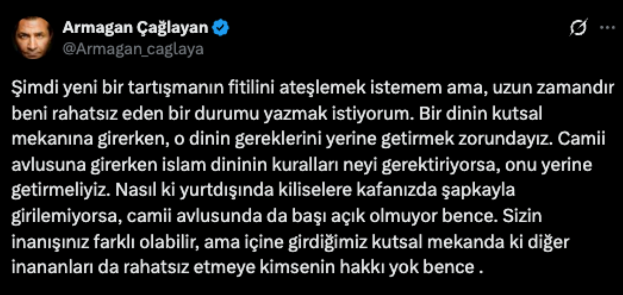 Çağlayan, yaptığı paylaşımda isim vermeden “Bir dinin kutsal mekânına girerken, o dinin gereklerini yerine getirmek zorundayız. Cami avlusuna girerken İslam dininin kuralları neyi gerektiriyorsa, onu yerine getirmeliyiz" ifadelerini kullandı.
