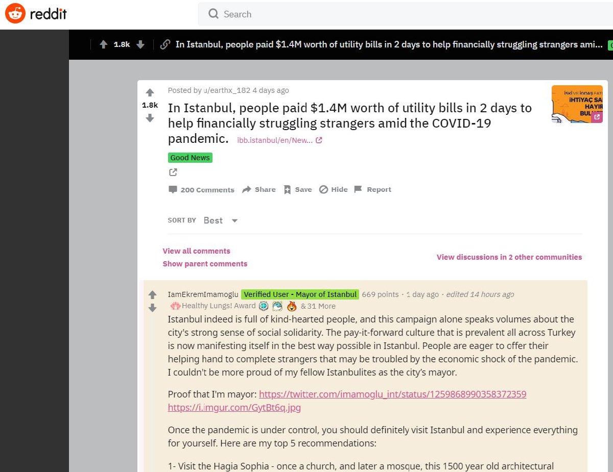 Reddit’te doğrulanmış hesap sahibi olması özellikle sosyal medyada gündem olan İmamoğlu, corona virüsü sonrasında İstanbul’u ziyaret edecek turistler ve vatandaşlar için tavsiyelerde bulundu.