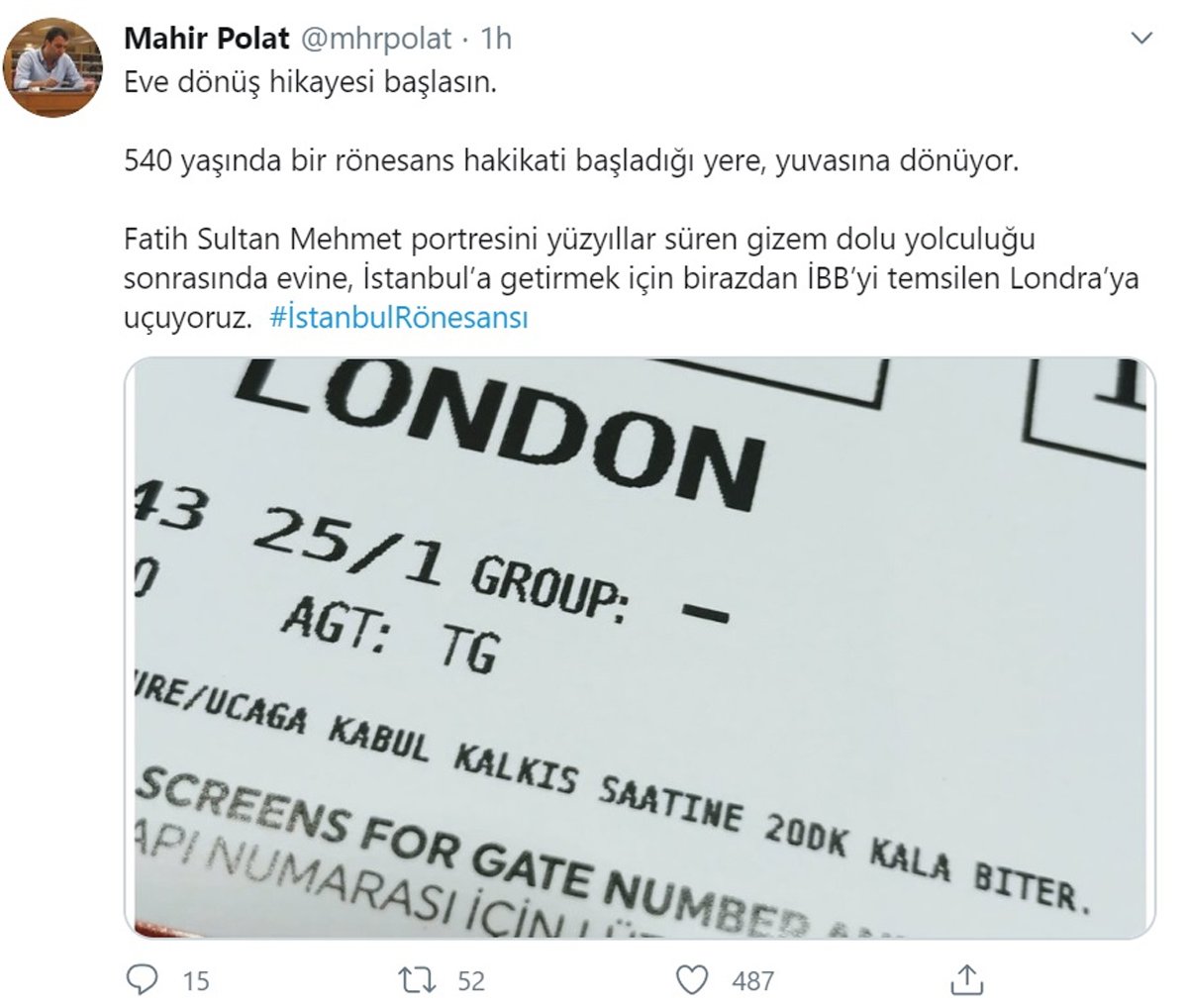 “Eve dönüş hikayesi başlasın” diyerek bir paylaşımda bulunan Mahir Polat, “540 yaşında bir rönesans hakikati başladığı yere, yuvasına dönüyor. Fatih Sultan Mehmet portresini yüzyıllar süren gizem dolu yolculuğu sonrasında evine, İstanbul'a getirmek için birazdan İBB'yi temsilen Londra'ya uçuyoruz” mesajına yer verdi; ‘İstanbul Rönesansı’ etiketini kullandı.