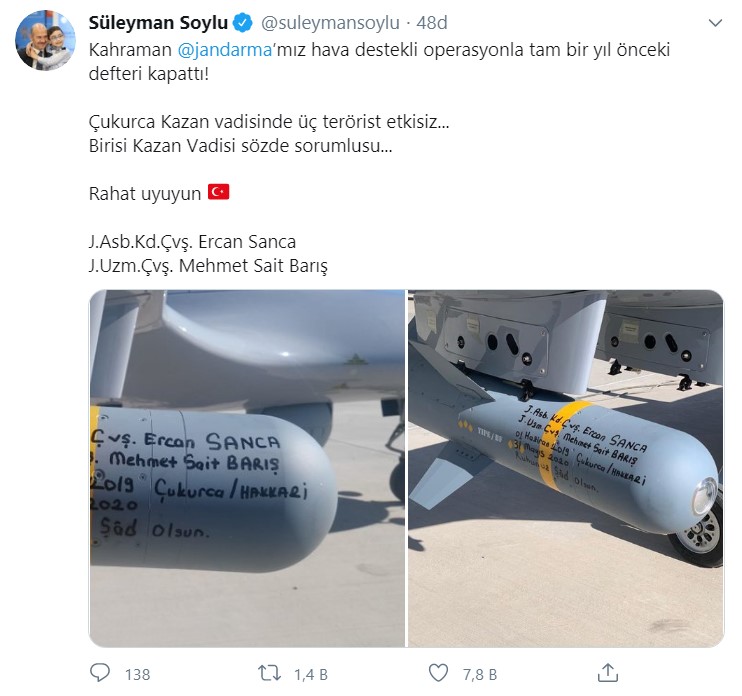 Twitter hesabından, terör örgütü PKK'ya yönelik Hakkari'nin Çukurca ilçesindeki operasyona ilişkin paylaşımda bulunan Soylu "Kahraman jandarmamız hava destekli operasyonla tam bir yıl önceki defteri kapattı. Çukurca Kazan vadisinde 3 terörist etkisiz, birisi Kazan Vadisi sözde sorumlusu." ifadesini kullandı.