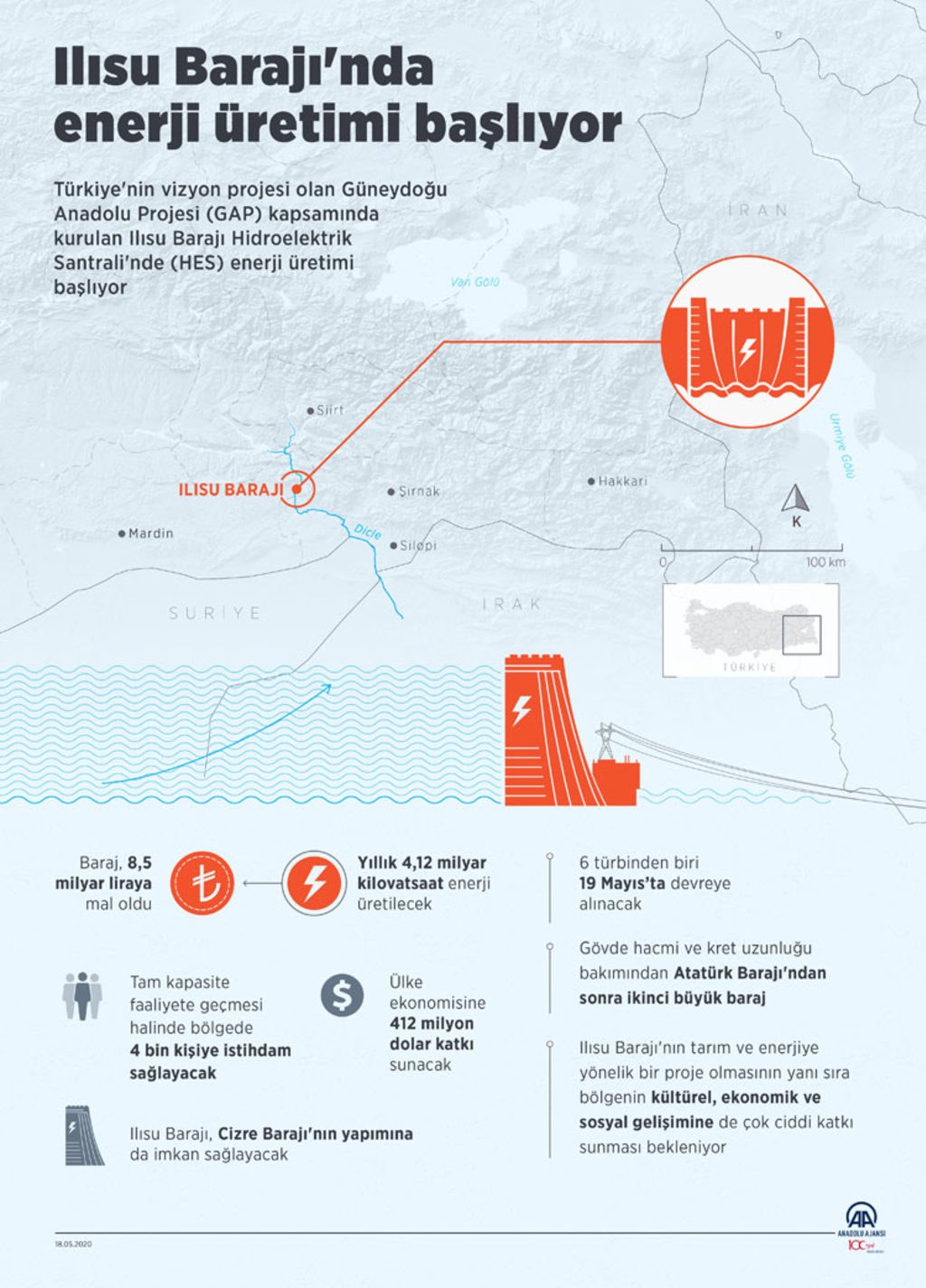 Fırat Nehri'nden sonra en büyük hidroelektrik potansiyele sahip olan Dicle Nehri üzerinde, enerji üretimi maksadıyla inşa edilen Ilısu Barajı'nda 19 Mayıs 2020 Salı günü ilk türbinde enerji üretimine başlanmıştır.